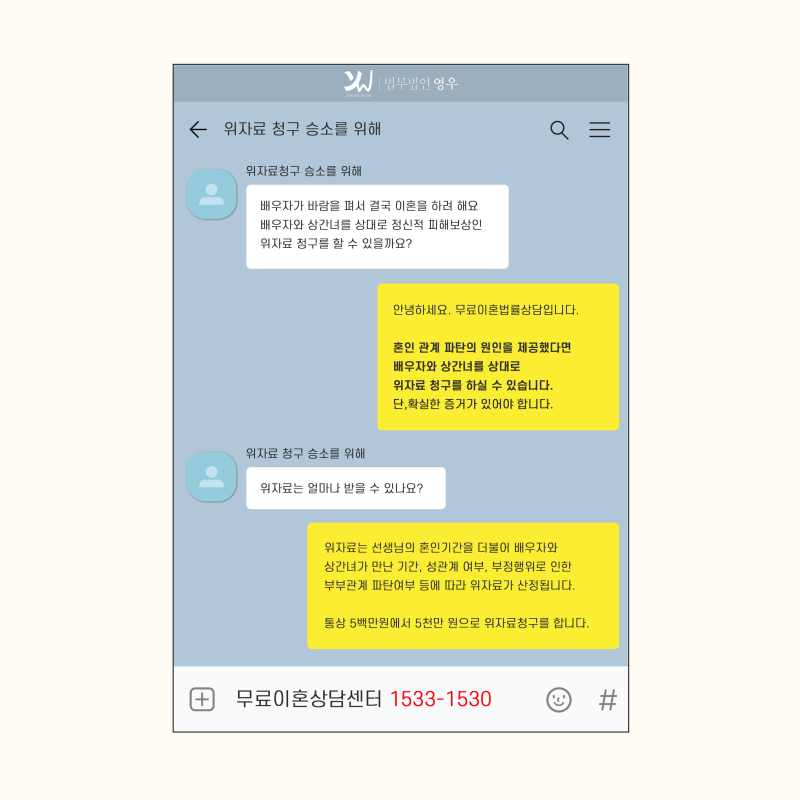 혼인 전 상속이나 유증, 증여 등과 관련된 재산은 특유의 재산에 속하는 경우입니다. 그러나 유지 또는 증가했던 부분이 있다면 재산분할에 속하게 됩니다.위자료 혼인 파탄을 초래한 상대방에게 손해 배상을 청구하는 것이기 때문에 재산 분할과는 다른 분류로 봐야 할 금액입니다.일반적으로 3,000만원에서 5천만원이 결정되며 상황과 정도에 따라 1,000만원까지 인정되는 양육권 부모가 아니더라도 시부모나 부모인 제3자를 양육자로 정할 수 있습니다. 친권과 양육권을 함께 지정하는 경우가 많지만 각각 지정도 가능합니다. 양육권자로 지정된 경우 당사자로부터 양육비 청구를 받을 수 있습니다. 동해 태백 속초 삼척 인제 무료이혼상담 이혼무료상담변호사 수임료법률사무소이처럼 이혼은 법리적인 문제가 얽혀 있기 때문에 일반인들에게는 많은 어려움이 있습니다.제3자가 들으면 이해할 수 없는 사건사고이기 때문에 그 고민과 조언을 해주는 입장에서는 당장이라도 이혼하라는 식의 말이 전부라고 생각합니다.지금 상황이 자랑도 아닌 만큼 숨겨놓고 혼자 힘들어하시는 분들도 계십니다.하지만 모든 것을 떠나서 지금 현재는 자기 자신의 신중한 결정이 중요해요.앞으로의 일을 위해 후회없는 선택이 되었으면 좋겠습니다.현재 상황에서 어떤 절차가 본인에게 적합한지 등으로 절차를 준비하는 데 어려움이 있다면 무료 이혼 상담으로 변호사의 도움을 구해보세요.현재 상황에서 어떤 절차가 본인에게 적합한지 등으로 절차를 준비하는 데 어려움이 있다면 무료 이혼 상담으로 변호사의 도움을 구해보세요.현재 상황에서 어떤 절차가 본인에게 적합한지 등으로 절차를 준비하는 데 어려움이 있다면 무료 이혼 상담으로 변호사의 도움을 구해보세요.