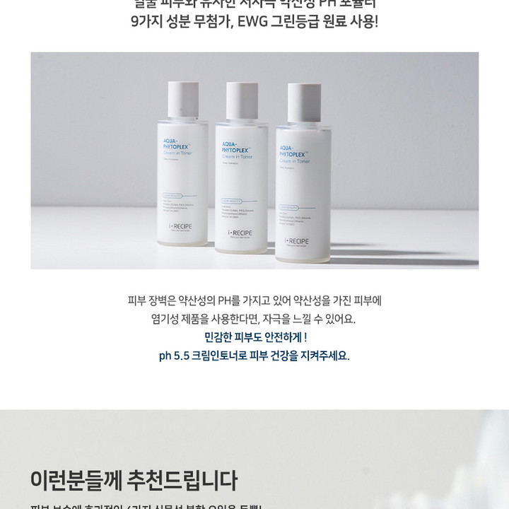 요즘 바람이 점점 강하게 불고 있기 때문에 본격적으로 피부가 건조하다고 느껴지는 부분에 미리 수분 토너로 충전함으로써 기초 단계에서 보습력을 높이고자 합니다.제가 현재 사용하고 있는 적절한 토너 팩이 없어서 적절한 제품을 찾다가 비건 화장품 아이 레시피를 사용해봤습니다. 「아이 레시피 아쿠아 피트 플렉스 크림 인토너」i RECIPE AQUA PHYTOPLEX Cream in Toner 120ml