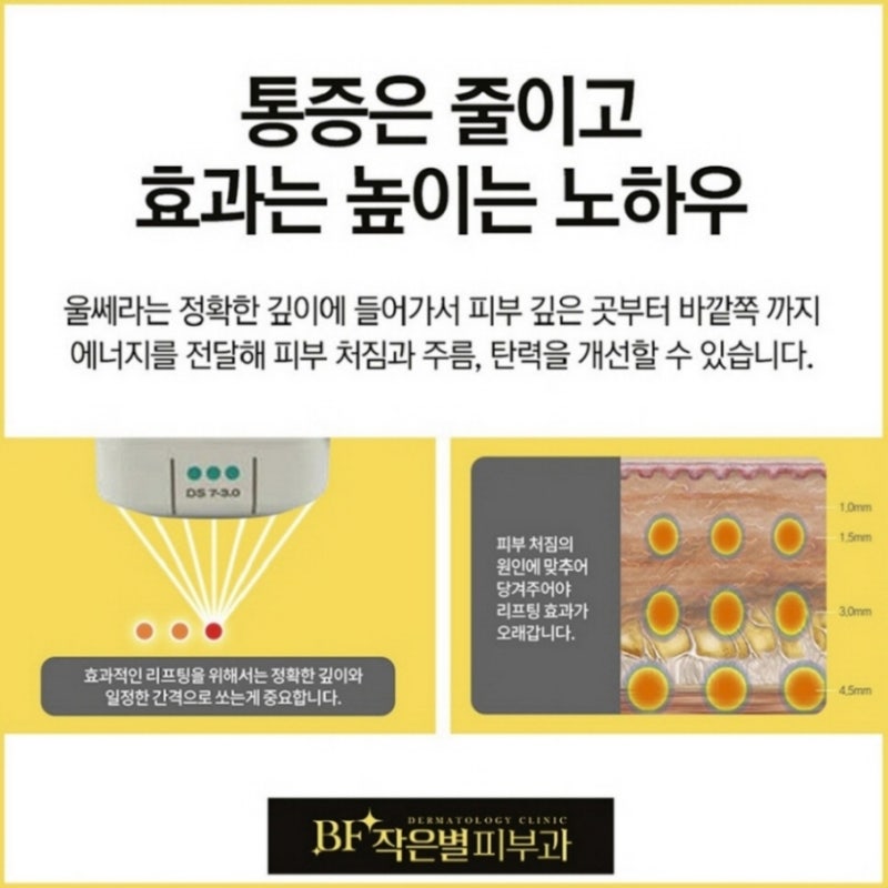 더블로우 골드 리프팅은 강하게 집적된 초음파 에너지(HIFU)를 피부 표면 아래 3~4.5mm 깊이의 근막층(SMAS)까지 전달하는 시술입니다.표면이 아닌 깊은 피부층에 에너지가 도달하는 리프팅 시술이기 때문에 피부 조직이 깊은 곳에서 수축하면서 끌고 가는 원리입니다.어떤 칩을 사용하느냐에 따라 진피층과 근막층을 동시에 리프팅해 콜라겐 재생과 피하지방층을 줄여 부분적으로 늘어난 지방과 탄력을 잃은 피부에 도움을 주고 전체적인 페이스라인을 정돈하는 데 효과를 기대할 수 있습니다.