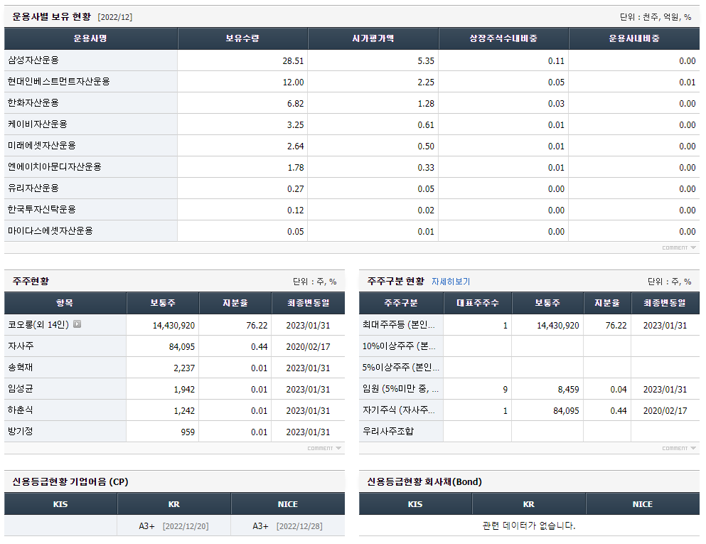 단기적으로 투자하는 경우에는 주주현황 정보가 필요하지 않으나, 장기적으로는 미래 비전과 기업 가치를 평가하고 분석하는 능력도 고려해야 합니다. 대주주들을 직접 만날 수는 없지만, 그들이 어떻게 뭉치는지 보는 것은 좋다.