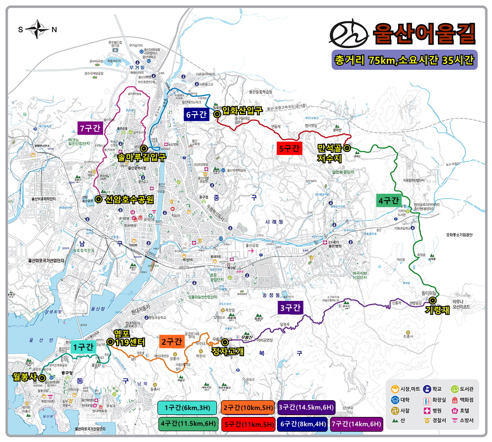 태화강전망대 – 남산어린이숲체험관 입구 – 신정중학교후문(화장실) – 삼호산삼거리 – 고래전망대 – 솔마루정전망대 – 와와삼거리